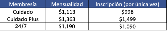 Son un conjunto de servicios de apoyo y acompañamiento a Adultos Mayores y a sus familiares que les permite reaccionar bien ante una emergencia y que se ofrece en dos tipos de Membresías Cuidado y Cuidado Plus. Ambas membresías son únicas en México y han sido desarrolladas con base en experiencias exitosas de Europa y Estados Unidos.